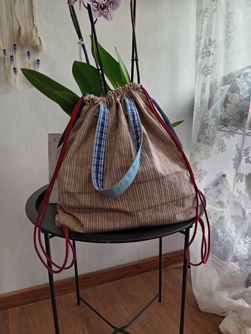 Tote bag versione zaino, creata con materiale di riciclo.